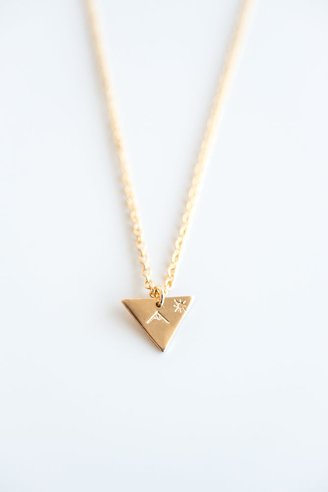 Each pendant features an triangle pendant hand stamped with a mountain and tiny sun. Each pendant is hand stamped to create a truly unique necklace. Pendant comes on a dainty cable link chain with lobster clasp.  Pendant is attached to the chain with one jump ring and will move on the necklace.